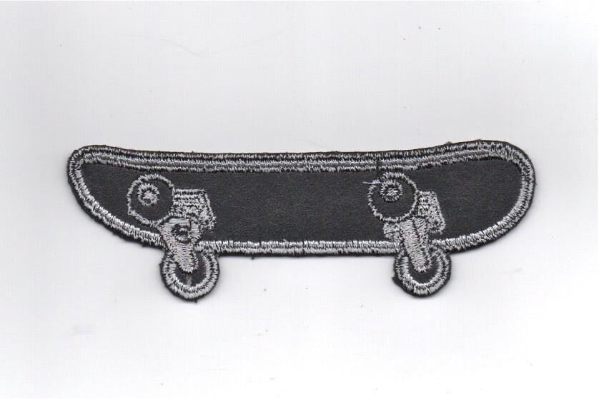 スケートボードのワッペンです。デッキとウィル部分は布になっており、白いキャンバスの様に 自由に色を塗ったり 描き込めます。トラックやアクスルナットは銀糸で刺繍されており 非常に凝った作りをしています。